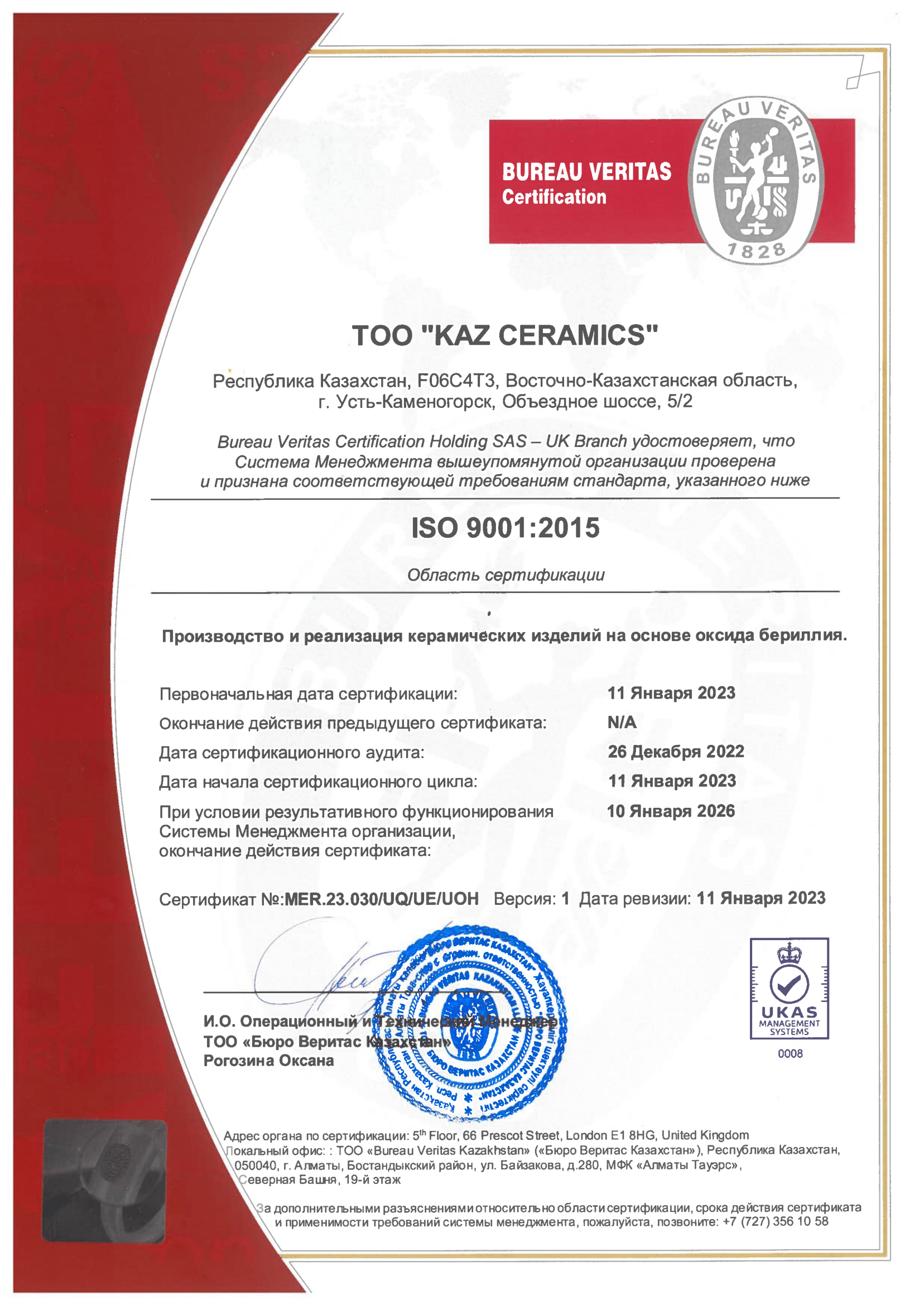 Система менеджмента качества применительно к производству и реализации керамических изделий на основе оксида бериллия ТОО «KAZ CERAMICS» сертифицирована на соответствие требованиям международного стандарта ISO 9001:2015 компанией BUREAU VERITAS.